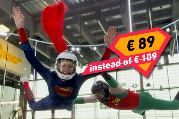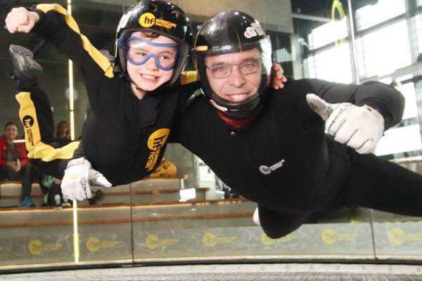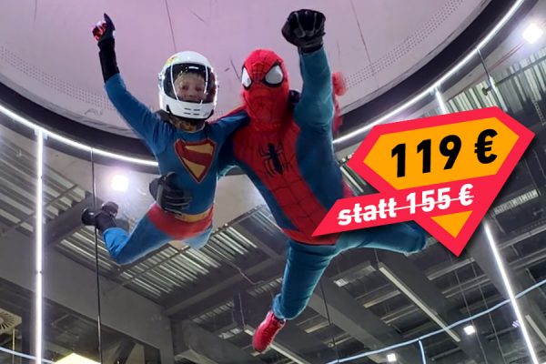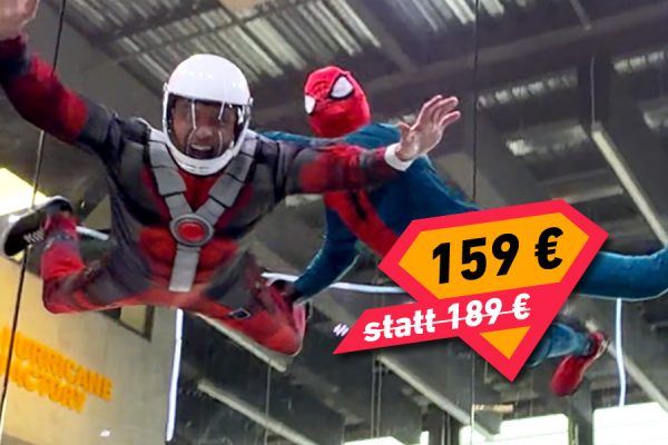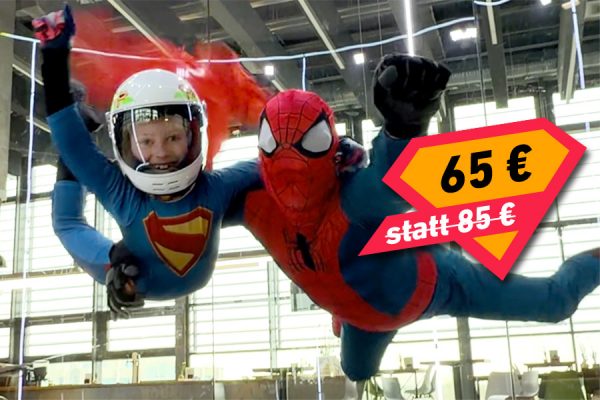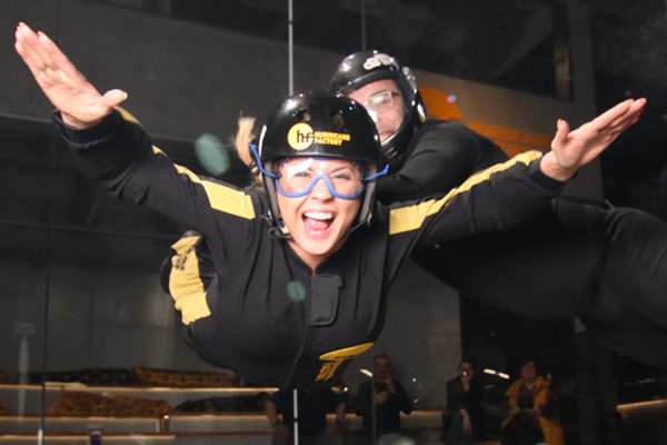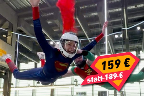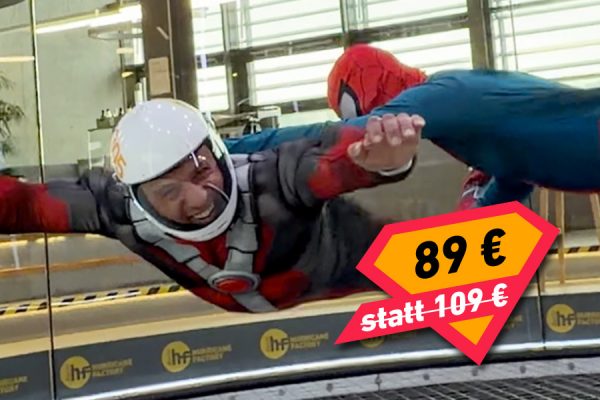 Zunächst fliegt jeder von euch 1,5 min allein unter der professionellen Anleitung des Instruktors. Sobald ihr euch ans Fliegen gewöhnt habt, könnt ihr dann gemeinsam abheben: Ihr fliegt zeitgleich im Windkanal und könnt euch mit ein bisschen Glück sogar an den Händen fassen! Zum Abschluss geht es dann für euch beide noch einmal einzeln in den Windkanal – zum HURRICANE FLY UP!