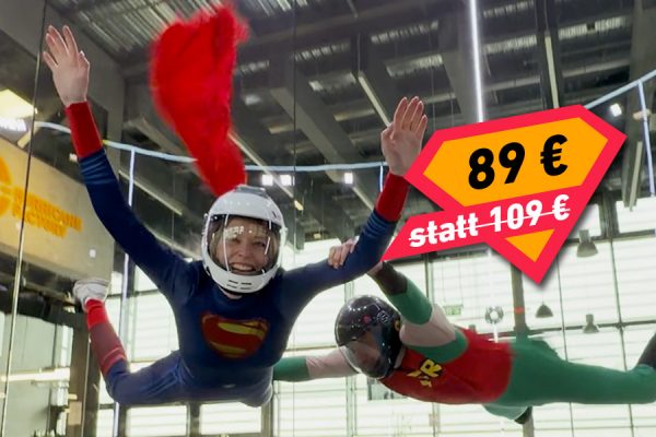 Zunächst fliegt jeder von euch 1,5 min allein unter der professionellen Anleitung des Instruktors. Sobald ihr euch ans Fliegen gewöhnt habt, könnt ihr dann gemeinsam abheben: Ihr fliegt zeitgleich im Windkanal und könnt euch mit ein bisschen Glück sogar an den Händen fassen! Zum Abschluss geht es dann für euch beide noch einmal einzeln in den Windkanal – zum HURRICANE FLY UP (Taxiflug)!